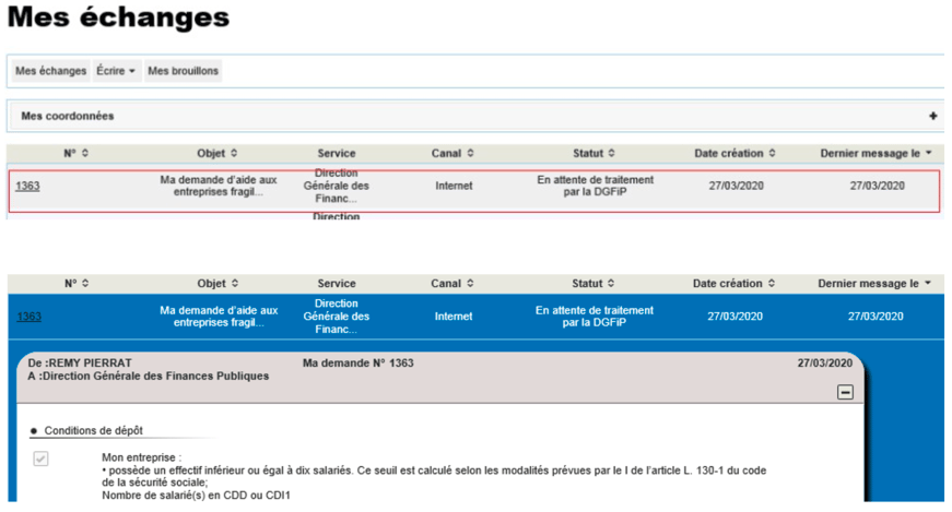 Attention : une seule demande par entreprise (code SIREN) sera acceptée. Et soyez vigilants : utilisez bien votre compte personnel de messagerie sous votre espace « Particulier » du site impots.gouv.fr, et non pas votre compte de messagerie de l’espace professionnel.