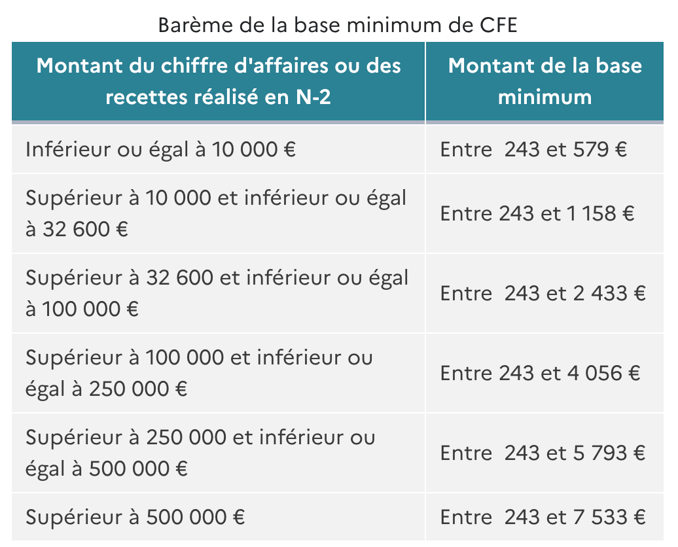 À défaut de locaux ou lorsque la valeur locative est très faible, la CFE est établie sur une base d'imposition minimum dont le montant est fixé par la commune ou la collectivité locale en fonction du chiffre d'affaires ou de recettes réalisé en N-2, et selon un barème encadré par la loi (voir tableau ci-après) :